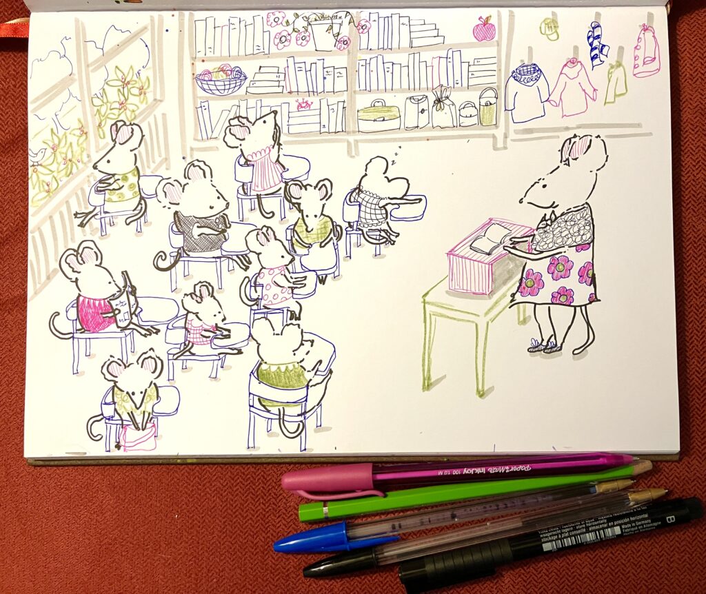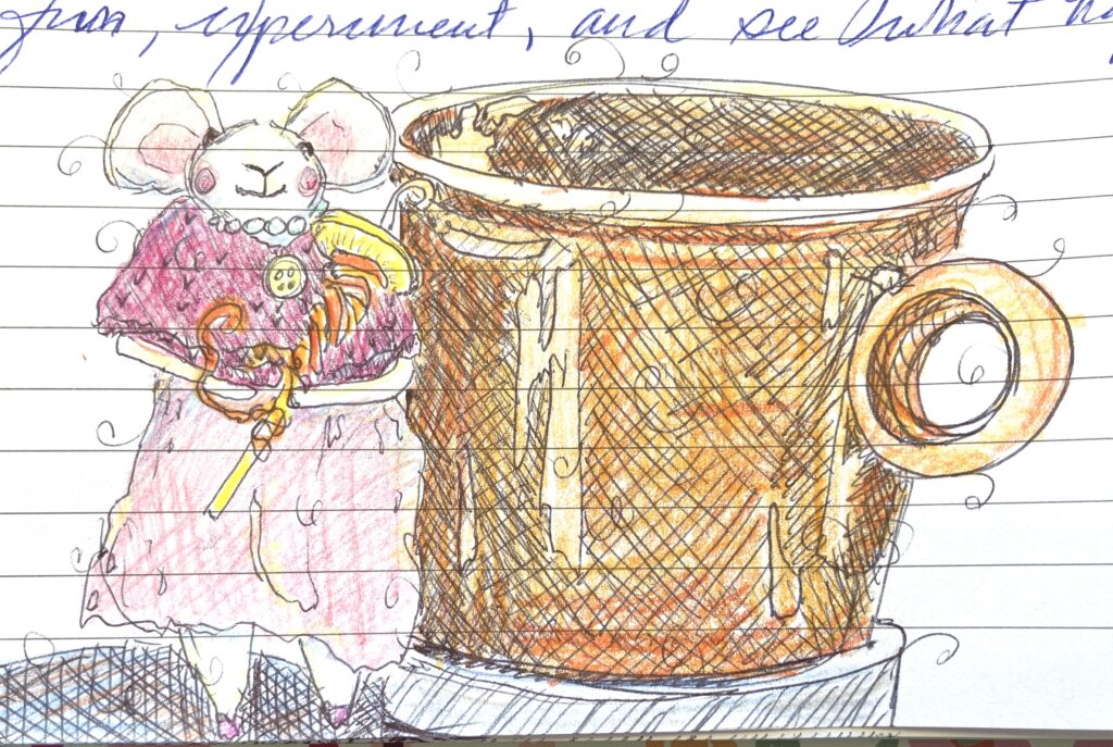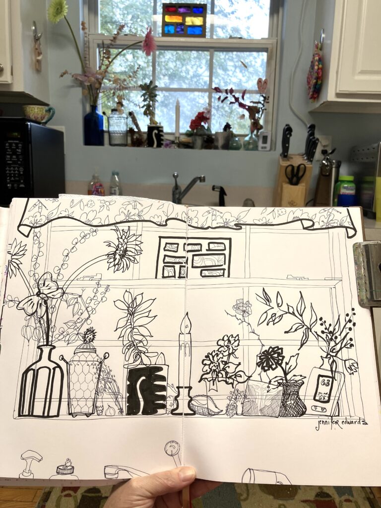 I continue to draw every morning and at other times too. Life has been a bit busier lately which decreases the amount of drawings in my large sketchbook, but that’s ok. It isn’t about trying to create more and more drawings, but rather to sink into my life with my pens to see more clearly the beauty that surely lies therein, even if I’m having a tough time seeing it readily. There’s some kind of magic that happens when my pen hits the paper. Ordinary becomes exciting. A mess transforms into lovely. Mundane becomes mysterious. Even worry is dispelled as I draw. The final result of the drawing has nothing to do with this transformational aspect of the process of drawing. Time slows. Heart stops racing. The world, at least within the confines of my sketchbook, is set to rights.