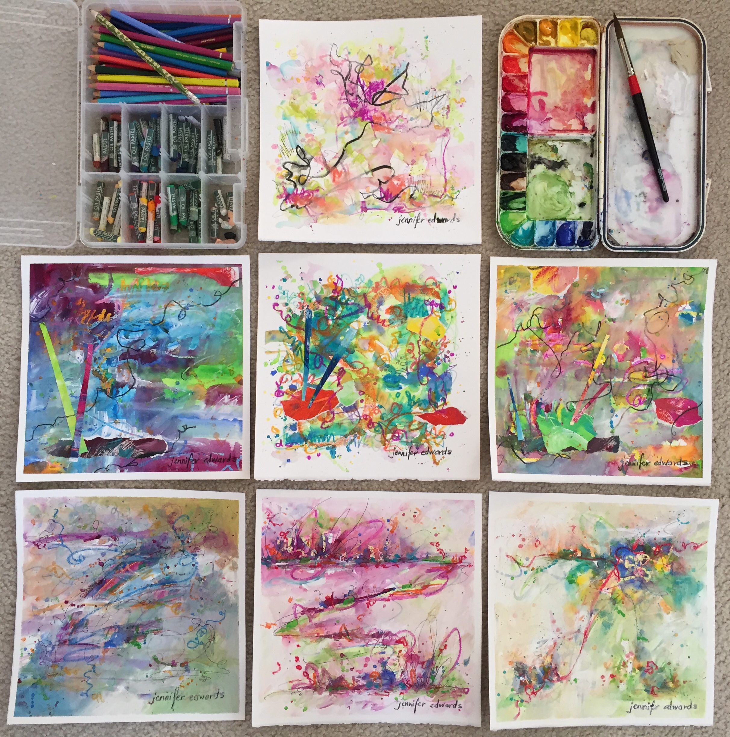Seven days. One week. The length of a nice vacation or a hike on the Appalachian Trail. Each and every day of creating marks on 10″ x 10″ Fabriano Artistico watercolor paper, felt like a blind endeavor. I am not trained in abstraction nor have I an art degree. Each morning as I woke early and eager to begin these pages, I felt I had absolutely no idea what I was doing nor where I was headed. I may have had some vague notion of how I wanted to begin, what marks to put down first. But then it was my intent to respond intuitively to the marks, brushwork, colors and lines previously set down on the paper. In nearly every case i hit a point where I felt all was lost, I had run into a brick wall. But years of experience quickly move me in another direction, to keep going, to hang with it until…I start to see something.