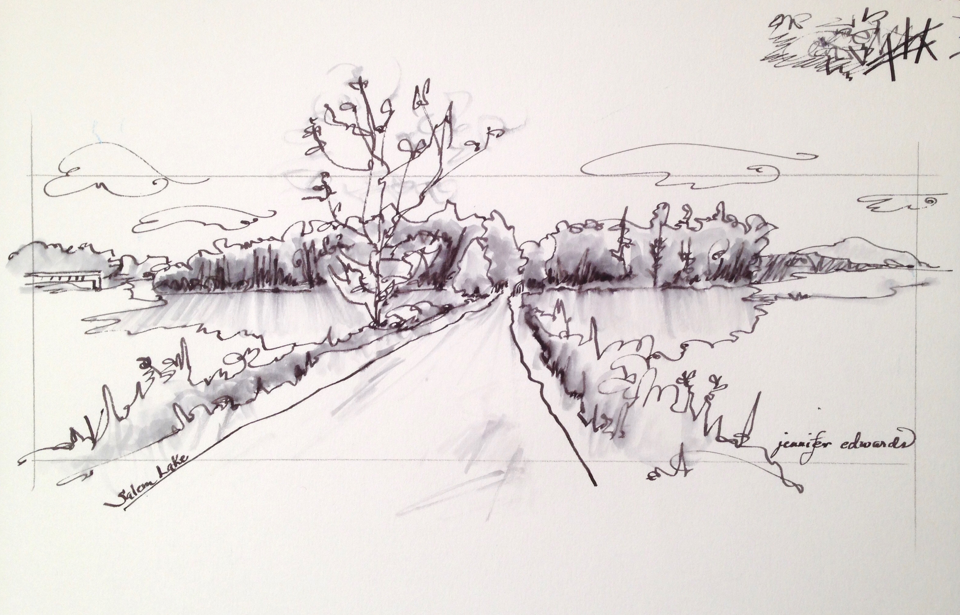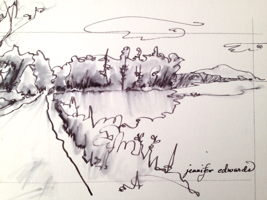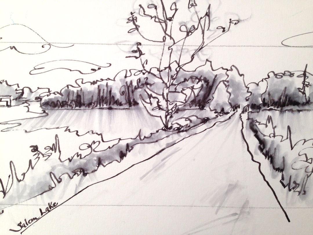 Though I myself moved on from that spot on the Lake to celebrate a boy turning 18, to drive the oldest daughter to the airport for her trip to England, and so much more…I look at this sketch and I’m there again, standing on the trail with sounds of fish jumping in the waters on either side of me. I will be there again, taking in the panorama of this Lake, this Life, this Adventure.