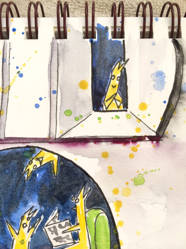This doesn’t happen every single time I draw something. No, sometimes a wall plug is just that…a wall plug. Or outlet. But it is in the focus and attention to things I wouldn’t normally engage with, that creativity is sparked. I can fan it into flame by drawing it and having a bit of fun imagining what these electric bolt people look like. Perhaps they need me to plug my lamp in so they don’t get too bored. Perhaps that little guy up in the right window reached out and zapped me as I sat staring into their home. I dunno. Could be.