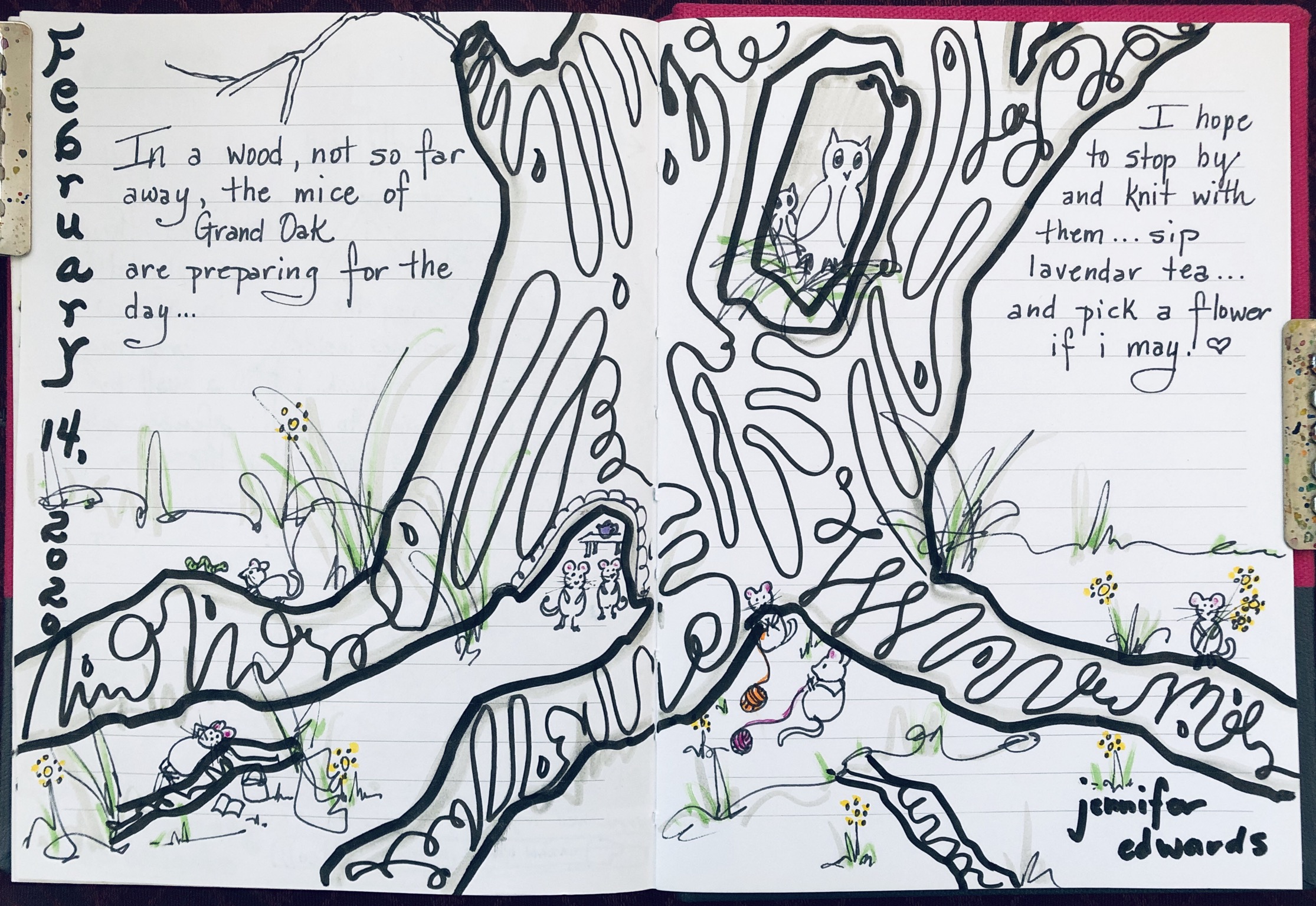 Or you imagine a large Oak tree and in drawing it, mice show up busily making a merry life all around while a friendly Owl watches over them.