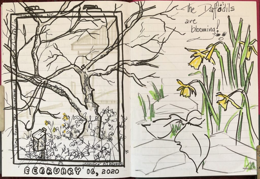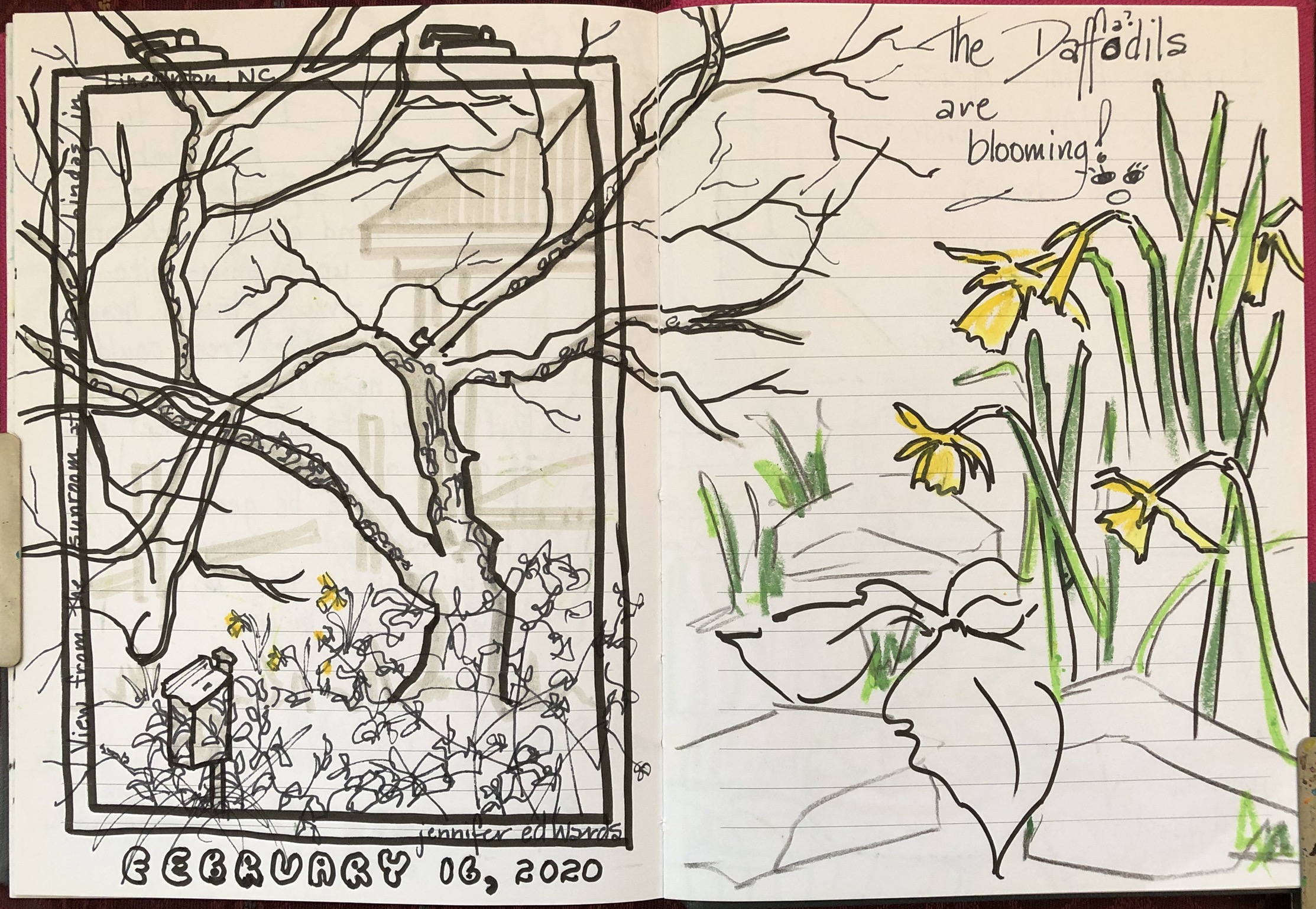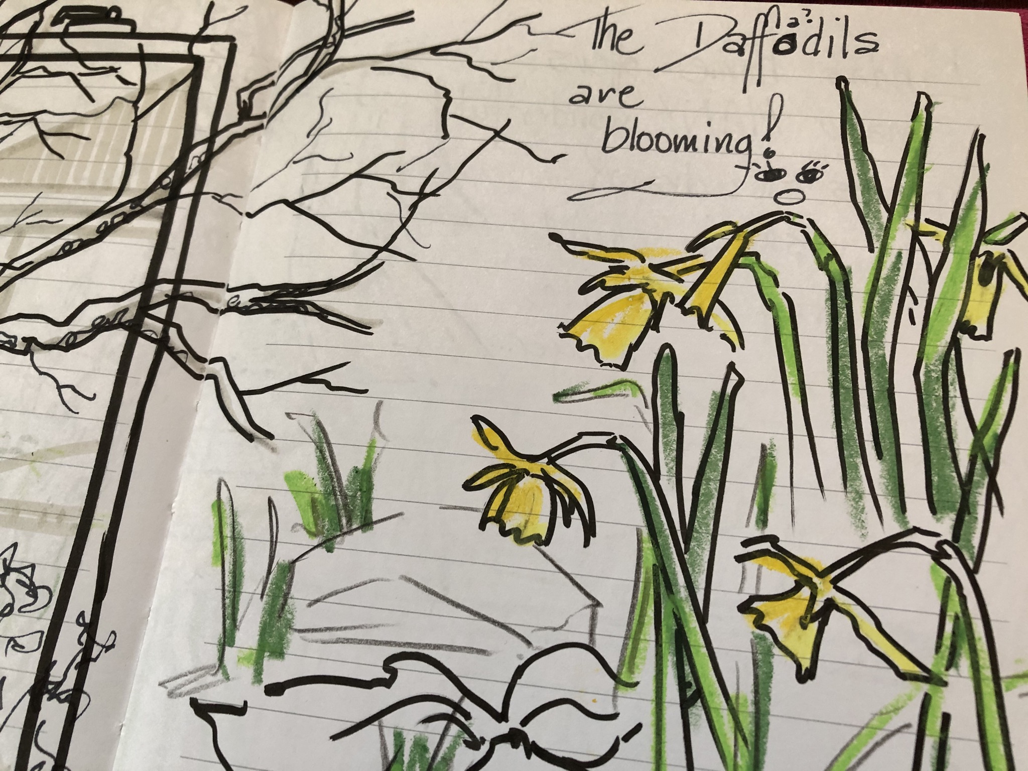 You draw the tree and in doing so you notice daffodils are blooming a full month early! And one must, simply MUST draw the daffodils too.