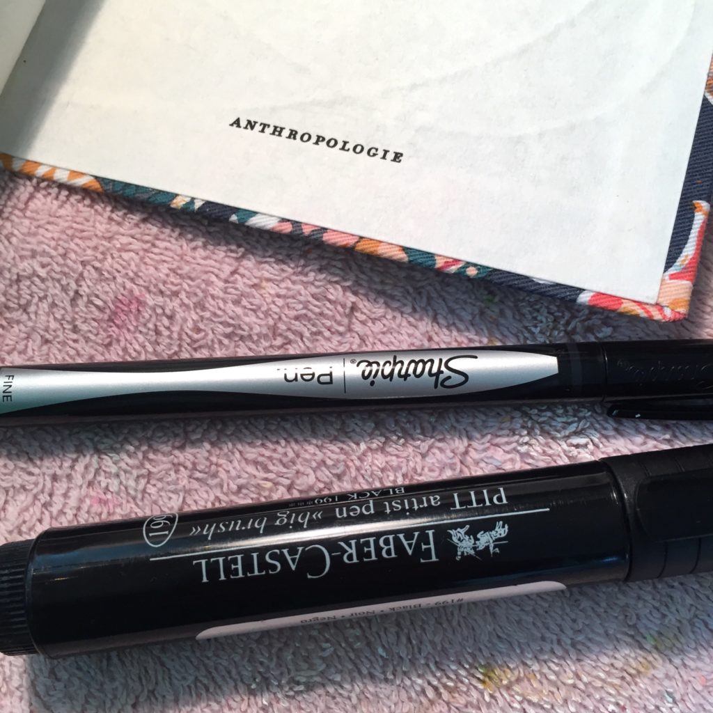 It is perhaps not a proper watercolor sketchbook, as in having the precise paper on which watercolor shines. But I love the almost cloth-like feel of this paper, and the handmade look of it with fabric cover and twine stitching. It is made by Anthropologie and I do hope they are still making these when I finish this one. Another will surely be in order. The very best thing is that my favorite markers, both fat and thin ones, do not bleed through the other side, thus allowing me to draw on all sides of the woven pages.