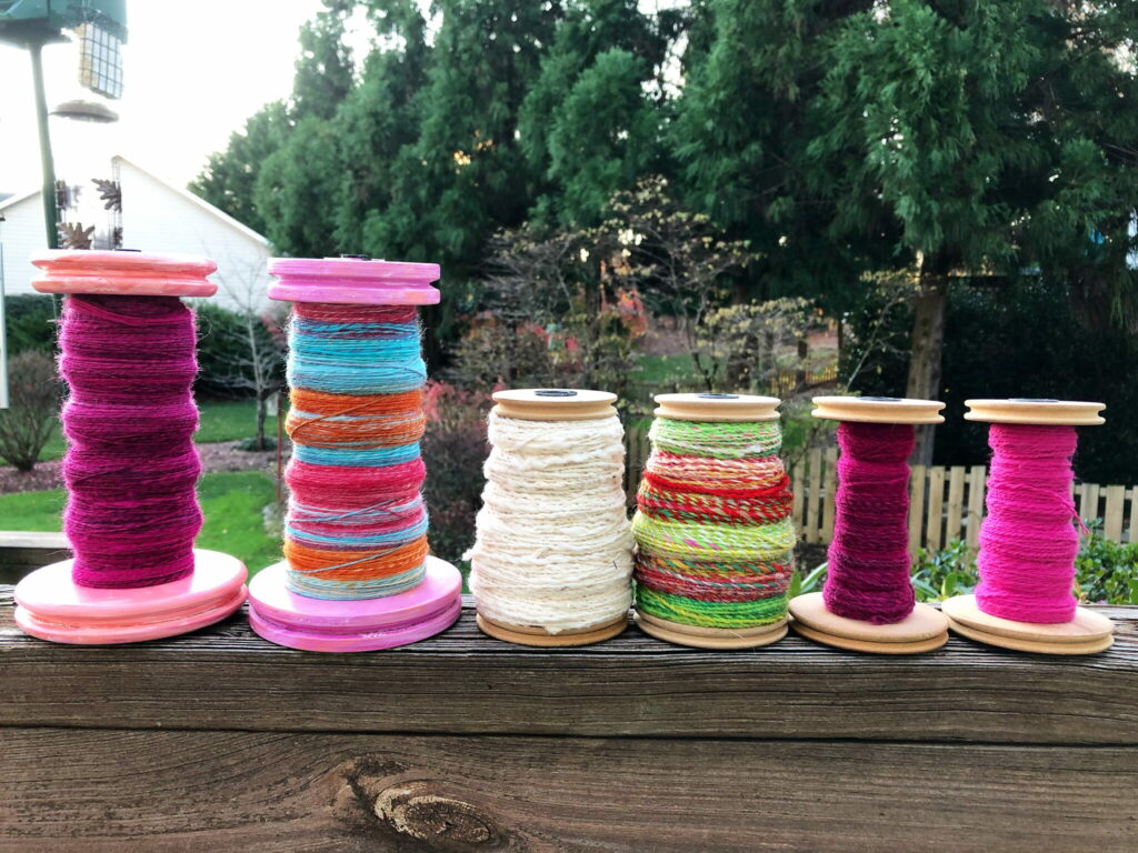 I spin yarn with a variety of tools from spindles to wheels. I love to create yarns of all kinds…thin and colorful, thick and juicy, smooth to textured art yarns.
