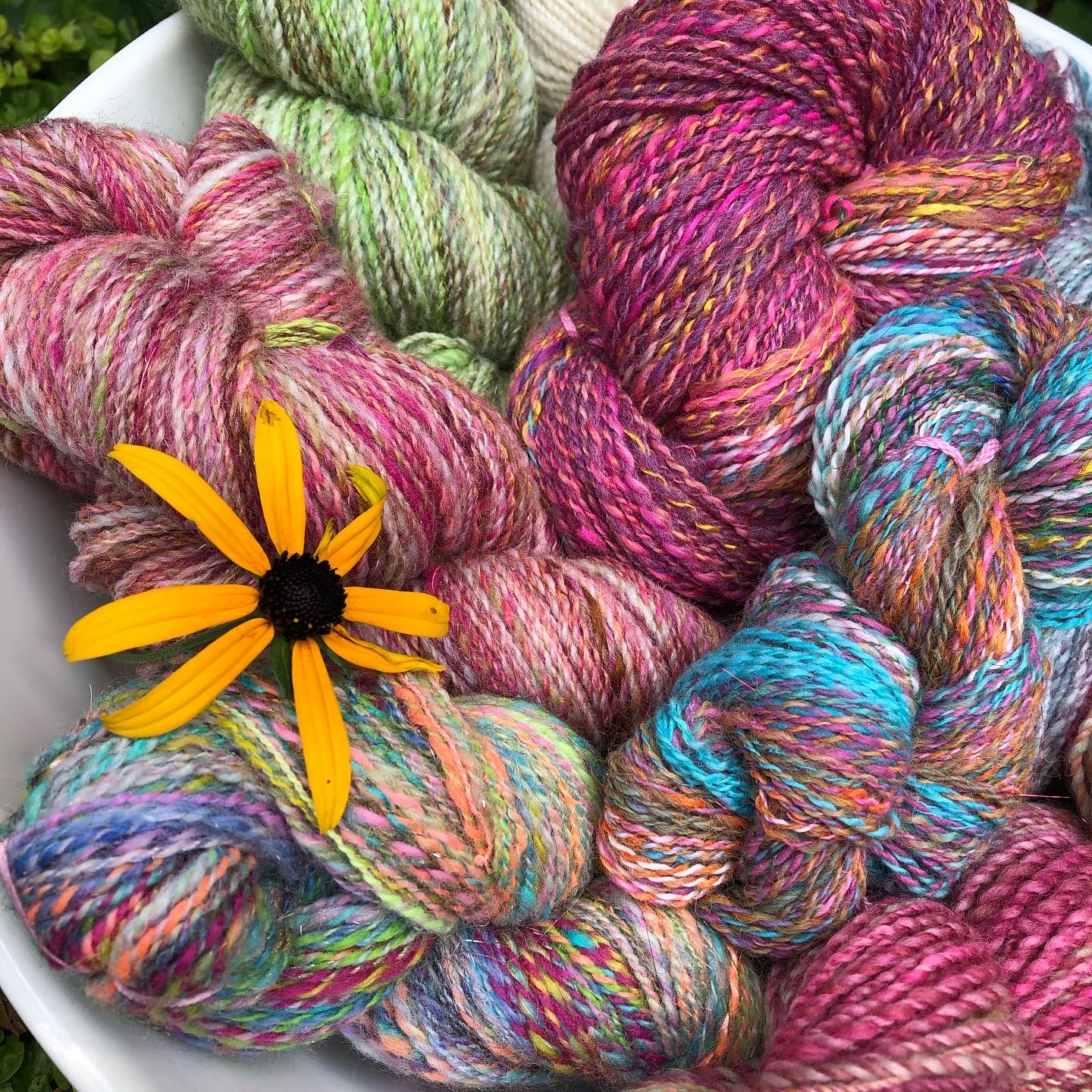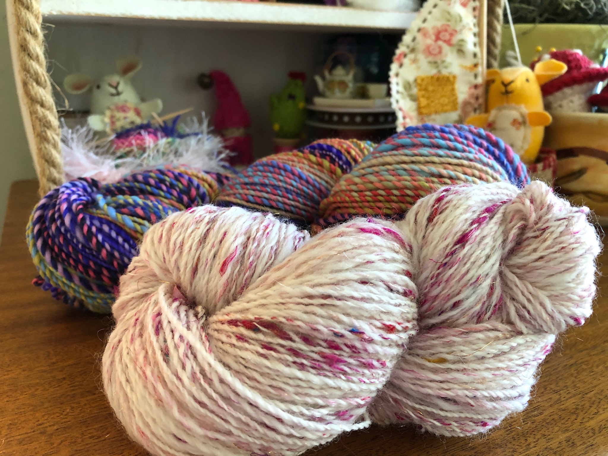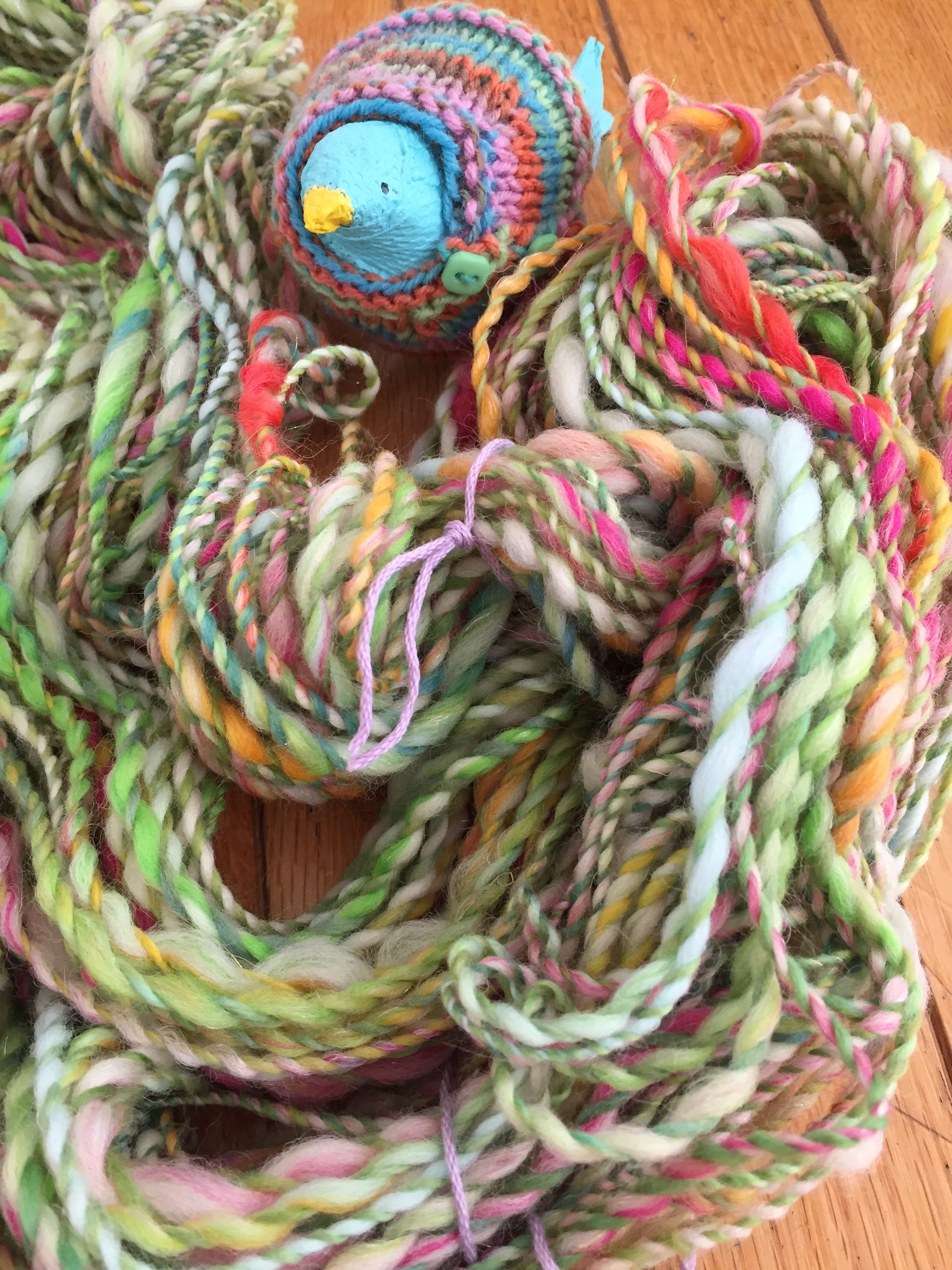 I spin yarn with a variety of tools from spindles to wheels. I love to create yarns of all kinds…thin and colorful, thick and juicy, smooth to textured art yarns.