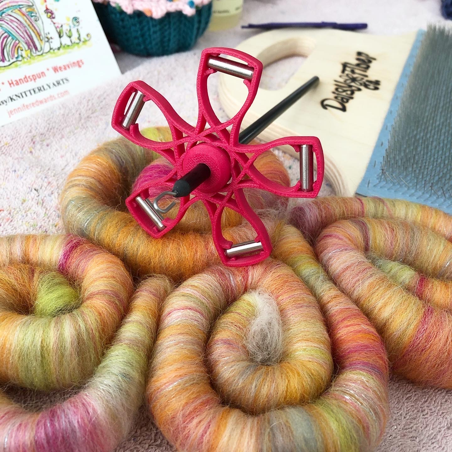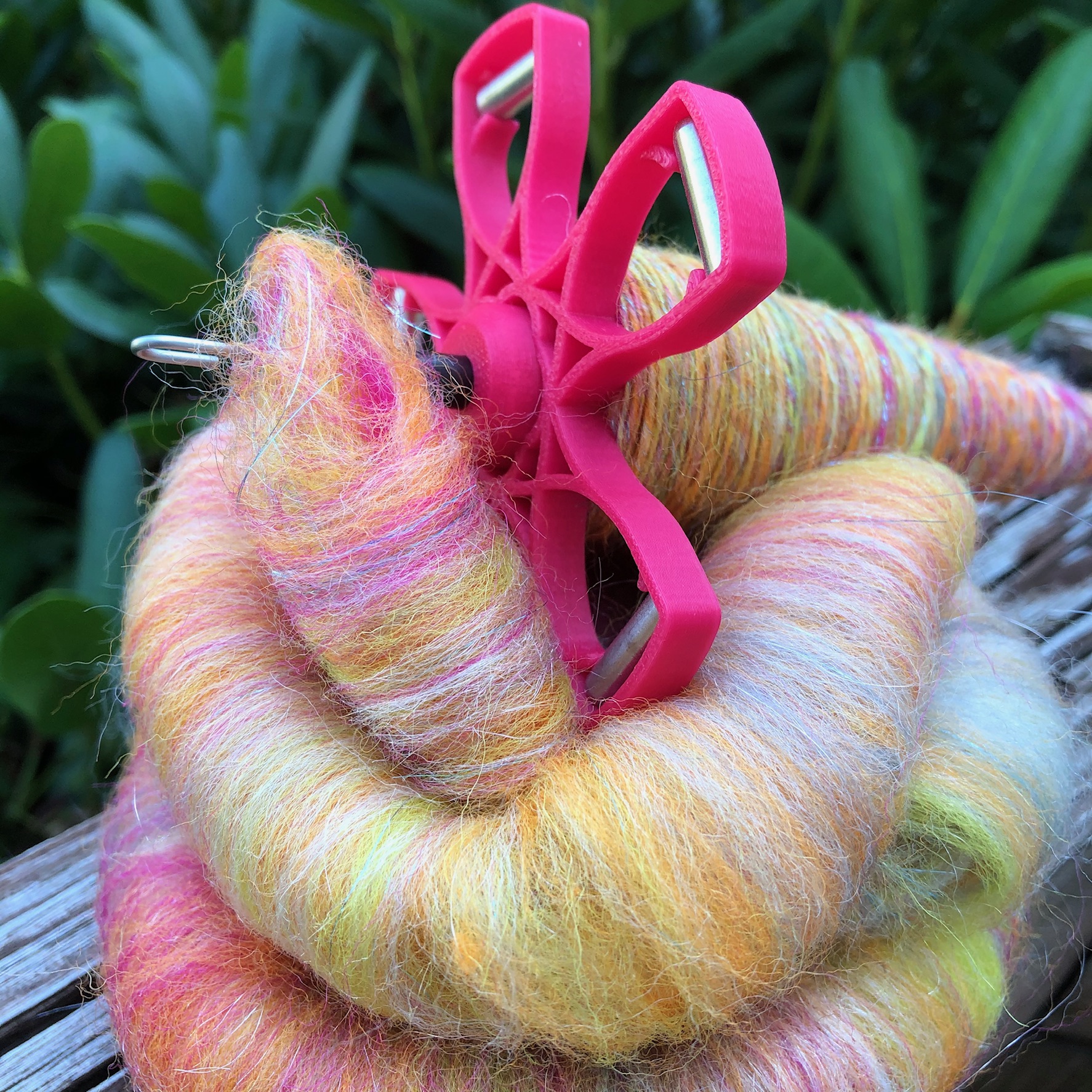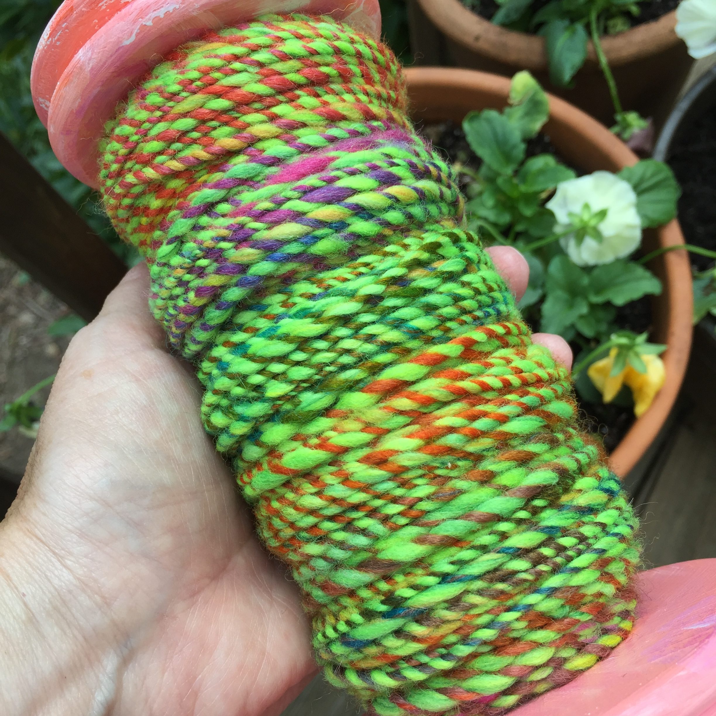 I spin yarn with a variety of tools from spindles to wheels. I love to create yarns of all kinds…thin and colorful, thick and juicy, smooth to textured art yarns.