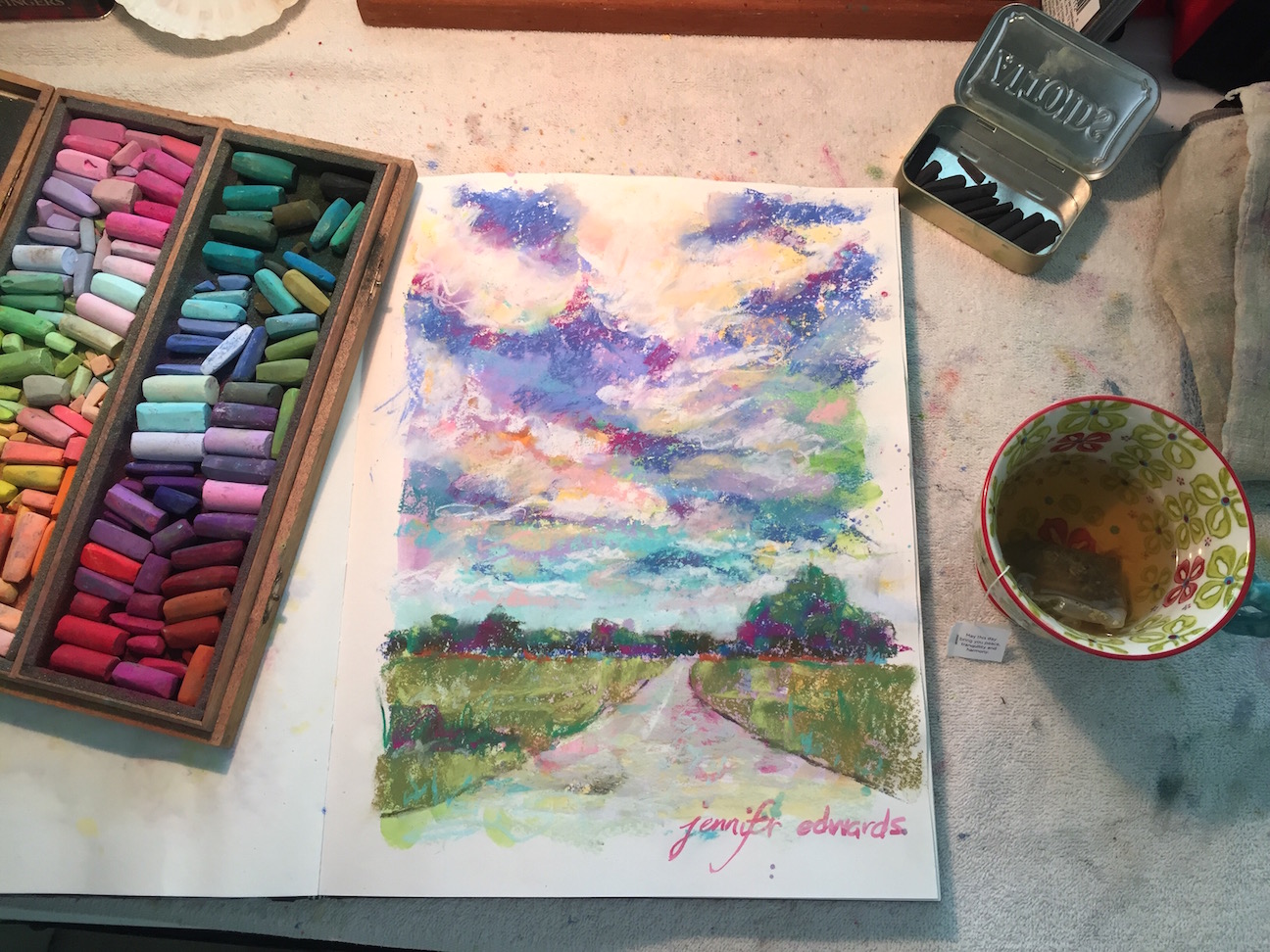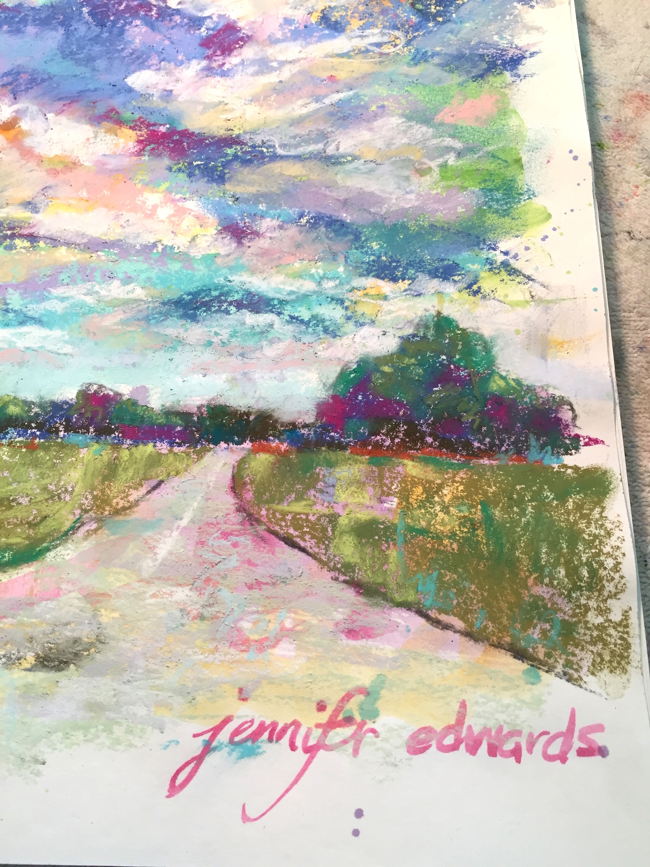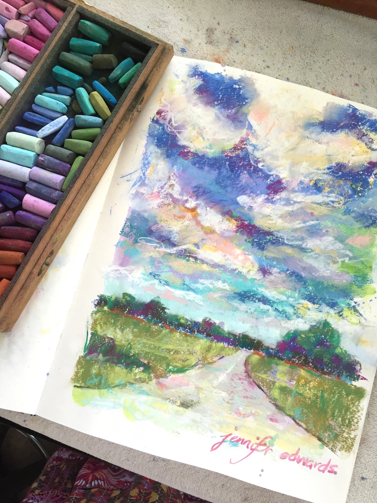 Then one day, again many years ago, I got out a wooden box filled with Rembrandt soft pastels that my grandmother had given me when I was child. Holding a stick on its side, I swooshed the pigment on the page, and there it was again…that feeling that magic was afoot. In neither instance did this magical feeling have to do with WHAT I was creating on the paper. In fact, if you saw these early attempts, you would not be particularly impressed as they looked much like what a kindergarten artist might create. I did not care. The magic was in the process of putting color onto paper. Or was it in the seeing of these colors as they went onto paper? Or was it simply the initial discovery of new mediums?