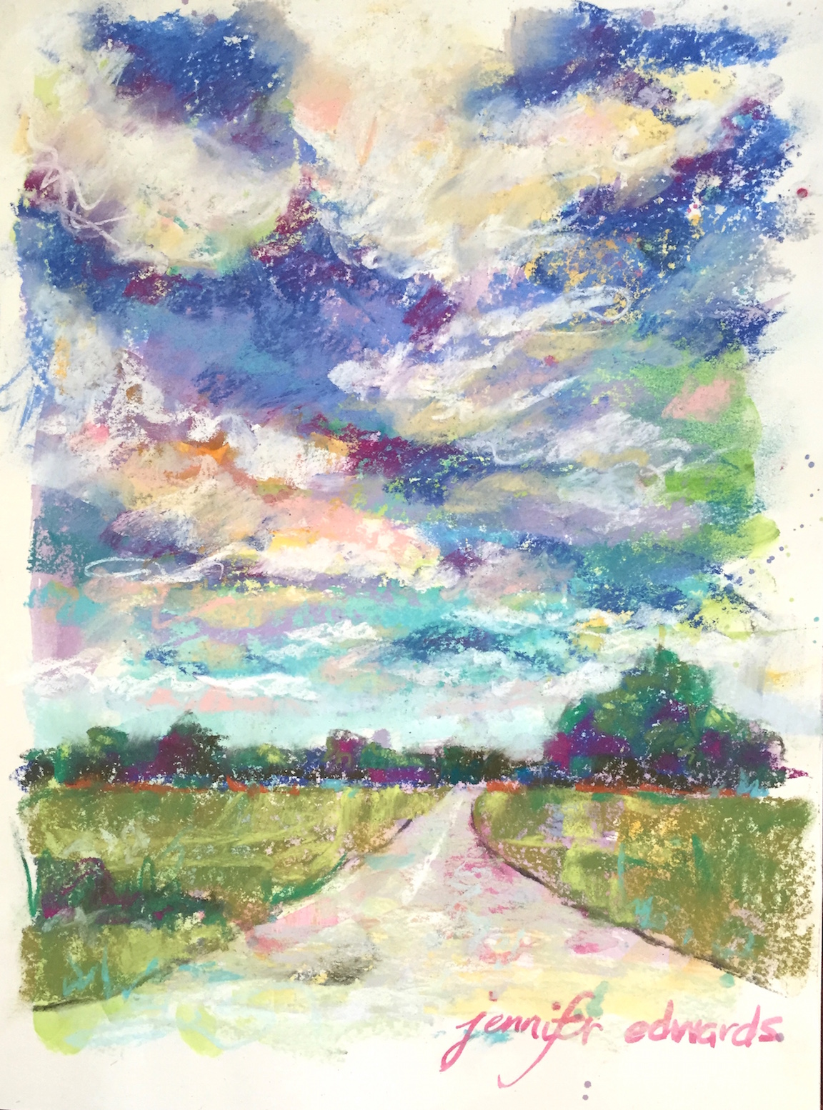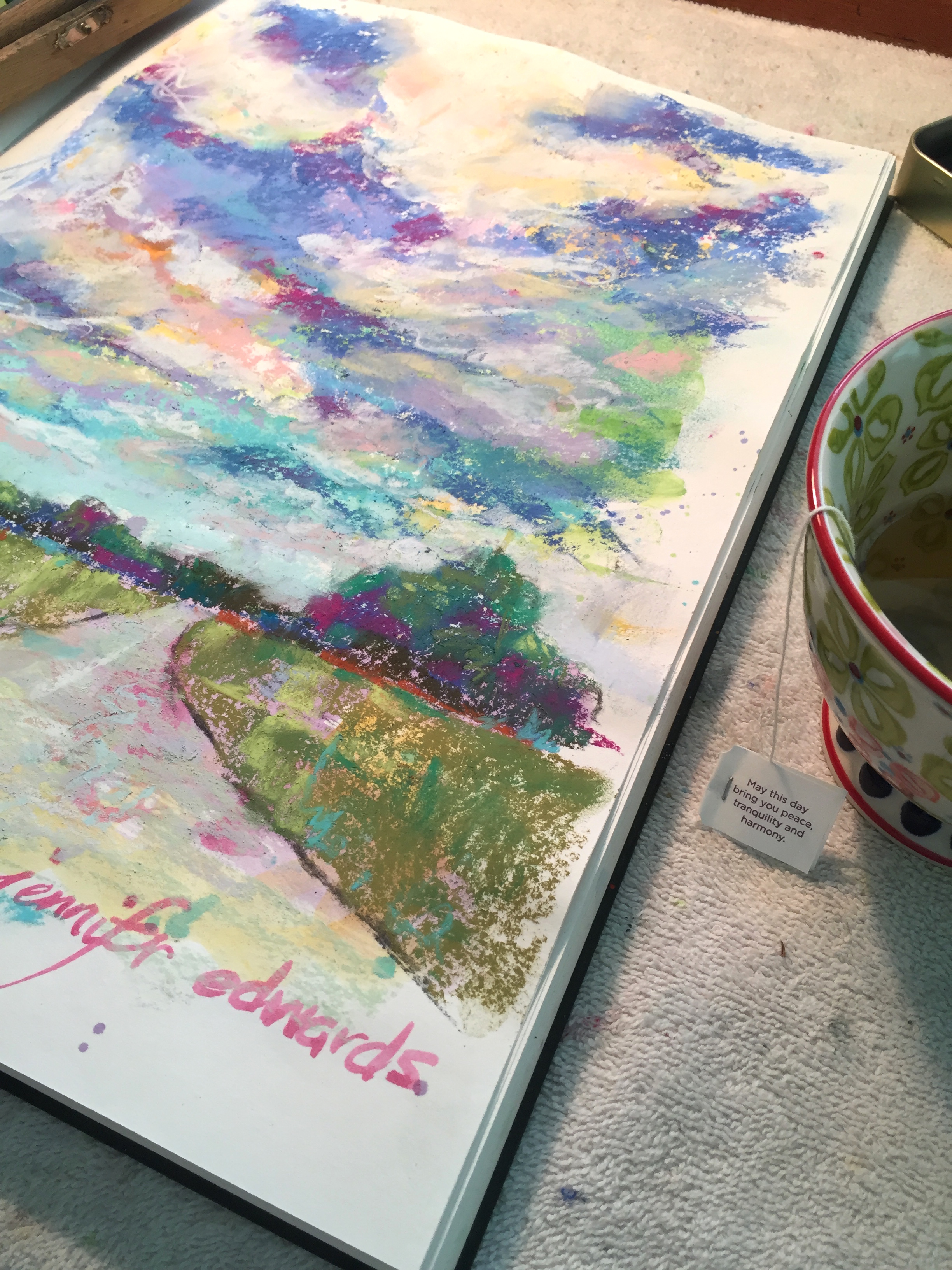 On and on, page after page now in this book, some abstract, some representational. This particular one, made last week after being blown away by the cloud formations at the top of our hill on Silver Dapple Lane. You see, the magic begins with inspiration, with beauty seen, with a desire to lasso it onto paper, or free it for interpretation, or something. But after I stepped back from trying to recreate what I saw and felt up on my favorite lane, I knew…